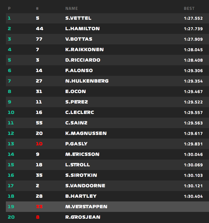 De Ferraricoureur wist Hamilton op bijna 0,2 seconde achter zich te houden, de marge op Bottas bedroeg bijna 0,4 seconde. Kimi Räikkönen kon zijn teamgenoot niet volgen, de Fin gaf een halve seconde toe op Vettel en werd daarmee vierde.