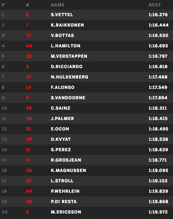 Net nadat de vlag gevallen was maakte Kimi Räikkönen het feest voor Ferrari compleet door de tweede positie te pakken op 0,168 seconden achter zijn teamgenoot. De volledige eerste startrij zal morgen bij de start van de race rood gekleurd zijn. De tweede startrij zal compleet grijs zijn, Bottas mag als derde aan de race beginnen met Hamilton vlak achter hem op P4.