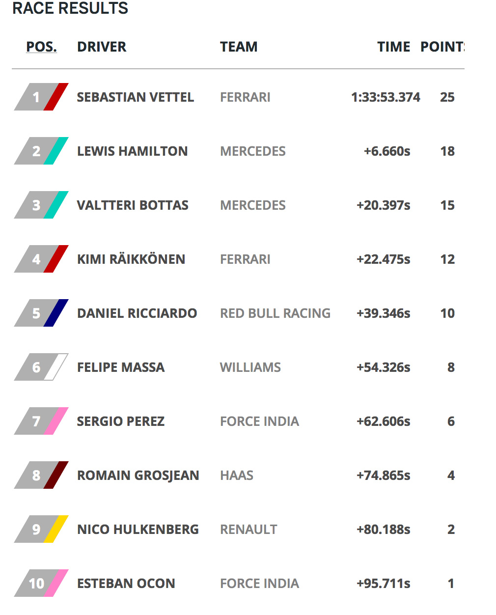 Vettel die al eerder zijn banden wisselde dan de concurrentie, kwam door de stops aan de leiding. Die gaf hij niet meer uit handen en pakte zo zijn tweede zege van het seizoen.
