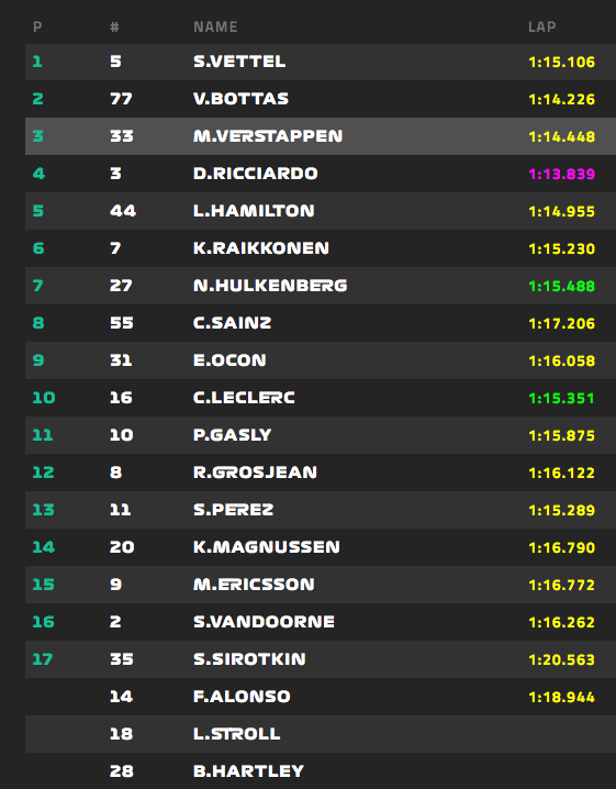 Max z’n teamgenoot Daniel Ricciardo wist als vierde de eindstreep te passeren door Hamilton achter zich te houden die deze race duidelijk geen kans zag om zijn Mercedes langs de Red Bull te sturen. De snelheid zat er bij de Engelsman minder goed in dan normaal het geval is, waardoor hij weinig kon uitrichten. Ricciardo noteerde in de voorlaatste ronde nog even de snelste tijd op 1:13.839.