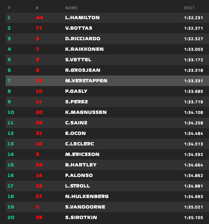Zijn teamgenoot Daniel Ricciardo deed het aanzienlijk beter. Lange tijd had de Australiër de snelste tijd in handen, maar zag die in rook op gaan toen in de tweede helft van de sessie de Mercedessen aanzetten voor een snelle tijd. Hamilton noteerde in 1:32.231 de rapste rondetijd. Valtteri Bottas wist op 0,140 seconde in het spoor van de regerend kampioen te blijven.