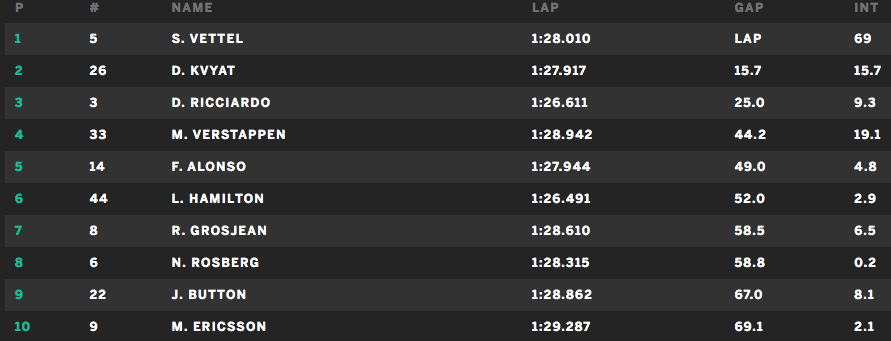 De Duitse Ferrari coureur verschalkte de twee Mercedessen, met in zijn kielzog teamgenoot Kimi Räikkönen. De Mercedes coureurs wisten niet goed van hun plek te komen en verloren flink wat terrein. Gedurende de chaotische race kwam met name Rosberg nog goed opzetten naar de tweede positie, terwijl Hamilton een race kende die hem weinig geluk bracht. De regerend wereldkampioen schoot in de eerste ronde een keer van de baan, verloor veel posities, knokte zich terug en kwam wederom in de problemen. Schade aan de neus leverde hem een extra stop op, waardoor hij ver buiten bereik van de leider terug viel en uiteindelijk toch nog in de top tien wist te komen.