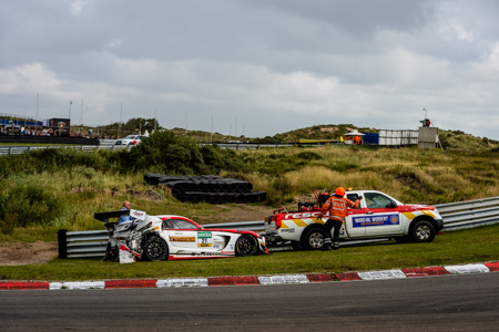 Al na enkele ronden schoot Rovigue van de baan met de Mercedes AMG GT3. De bolide parkeerde zijn staart in de bandenstapels en betekende einde verhaal. De race werd daarop geneutraliseerd en de marchalls hadden hun handen vol de wagen weg te slepen.