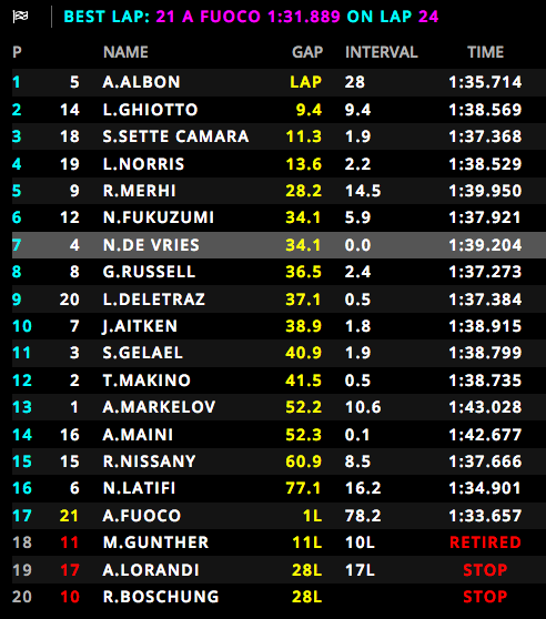 De ontketenede Lando norris wist zich op te werken naar de vierde plaats, maar kon Sergio Sette Camara niet van het podium stoten. De Engelsman kwam tot iets meer dan twee seconde achter de Braziliaan, maar moest daar de strijd staken vanwege het vallen van de finishvlag.