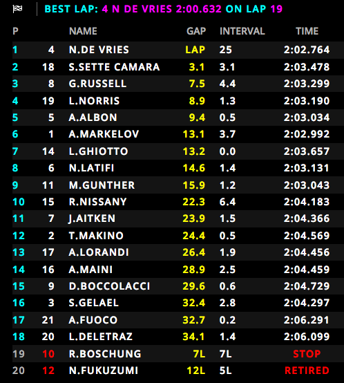 De Rus wist op de meet nog een positie te pakken nadat hij eerder al rondenlang in gevecht was met Luca Ghiotto. Zijn eerdere inhaalpogingen slaagden niet, maar op het rechte stuk van start/finish maakte hij optimaal gebruik van de slipstream en kwam exact op het juiste moment achter Ghiotto vandaag om zijn voorvleugel er net voor te kunnen prikken.