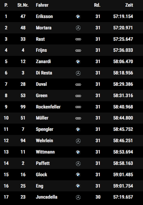 Edoardo Mortara leek lange tijd af te stevenen op de zege, maar moest na zijn pitstop genoegen nemen met de tweede positie. De Mercedes coureur maakte ene late pitstop van regenbanden naar regenbanden en bleef daarmee de eerder gestopte Audi van Rene Rast voor. Ten tijde van de pitstops van de koplopers was het Robin Frijns die de leiding in handen kreeg, maar ook hij moest nog een pitstop maken. De Nederlander wachtte tot de slotminuten alvorens zijn team te bezoeken en gaf daarmee een podium klassering uit handen. Frijns werd uiteindelijk vierde voor Zanardi.