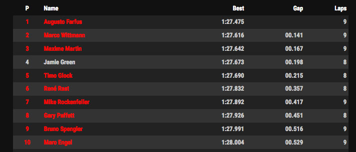 BMW deelt op het circuit van Zandvoort de lakens uit. Timo Glock die zaterdag nog wist te winnen, werd behoorlijk in de weg gezeten door Eduardo Mortara. Hierdoor kon de Duitser geen tweede stint rijden en op zijn beurt blokkeerde hij Mortara. Farfus was al in zijn eerste paar rondjes de snelste. Marco Wittmann reed de tweede tijd, voor Belg Maxime Martin.