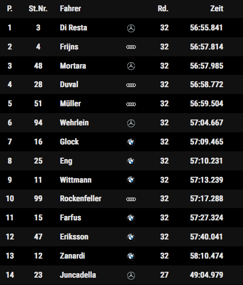 Frijns kliefde ondertussen gestaag door het hele veld heen naar voren en was een van de snelste wagens op de baan. Zijn Audi functioneerde geweldig, wat hem uiteindelijk een mooi podium opleverde in de allereerste avondrace van de klasse. De Nederlander reageerde na de race opgetogen: "Het was een dappere poging om van zo ver te komen op Edoardo, maar het lukte. Hij maakte een klein foutje en daar kon ik van profiteren. Ik heb een geweldige race gehad, een aanvaring met Timo Glock waardoor ik terug viel, maar ik kon me herstellen. Een heerlijke race!"
