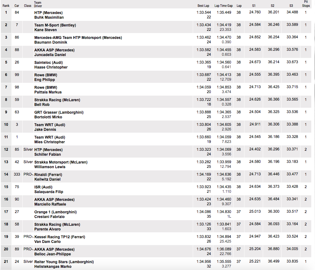 De tweede HTP Mercedes met Jimmy Eriksson en Dominik Baumann eindigde op de derde stek. Nederlander Jules Szymkowiak eindigde met zijn teammaat Fabian Schiller als eerste in de Silver Cup, voor jonge rijders.