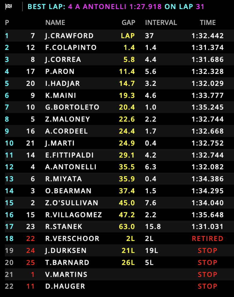 In de Formule 2 hoofdrace op zondag is Jak Crawford als eerste afgevlagd. Hij deelde het podium met Franco Colapinto en Juan Manuel Correa.