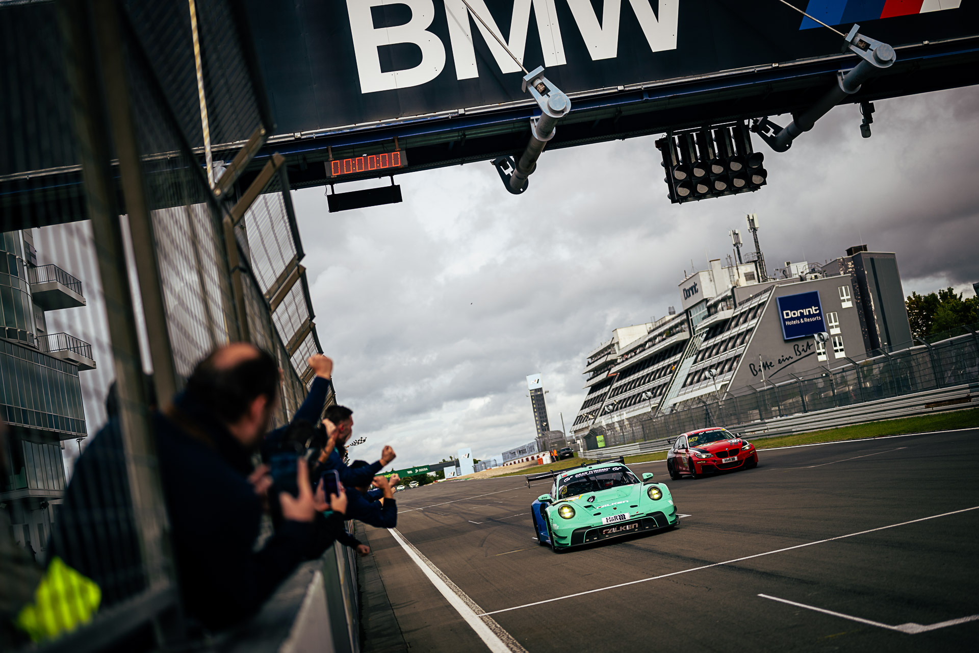 Voor Andlauer en Strum was hierdoor geen echter tegenstand. Deze kon misschien alleen uit eigen renstal komen, met Heinemann en Leuchter in de #4 Porsche. Alleen de achterstand, ondanks de moeilijke omstandigheden waar het op een droge baan, waar iedereen op slicks reed, toch begon te regenen. Het zou een 1-2 voor Falken Motorsports worden. Derde zou de #48 Porsche 911 GT3R van Kaya, Stursberg en Müller worden.