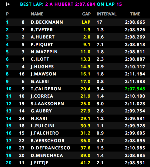 Op een opdrogende baan heeft David Beckmann de beste zaken gedaan in de eerste wedstrijd van de GP3 Series die in het voorprogramma van de Formule 1 rijdt. De Duitser wist vanaf de startlijn goed weg te komen en zijn positie gedurende alle zeventien de ronden vast te houden, ondaks druk van Ryan Tveter. De Amerikaan wilde de leiding graag overnemen, maar wist geen plek te vinden om naar P1 te gaan.
