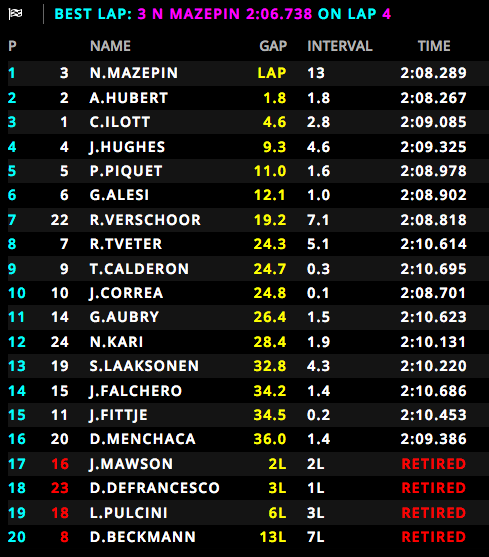 Nikita Mazepin wist de zege te pakken door Antoine Hubert voor te blijven. Callom Ilot gaf een aantal seconden toe op de mannen voor hem, maar wist zich wel los te rijden van Jake Hughes die als vierde werd afgevlagd. Mazepin klokte en passant de snelste raceronde en verdiende hiermee nog eens extra punten voor het kampioenschap. De Rus verstevigde zodoende zijn derde positie in de tussenstand van het WK.