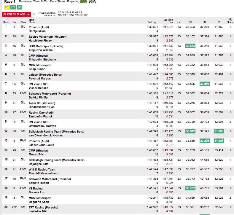Ricardo van der Ende pakte samen met Hutchinson Finlay de tweede stek. Simon Knap en Max Koebolt reden naar een vijfde positie, terwijl Beitske Visser als zevende boeken in gaat. Luc Braams en Duncan Huisman eindigde op een achttiende stek met de nieuwe Camaro en Koen Bogaerts en Mark van der Aa zagen hun eerste optreden in de GT4 European Series beloond met een negentiende stek.