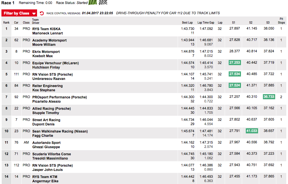 Niet alle rijders hielden zich aan de track limits en er werden ook wel en paar tikjes uitgedeeld. De wedstrijdleiding bestrafte resoluut de overtreders. Riccardo van der Ende en Max Koebolt reden een nette wedstrijd en profiteerde zo van de straffen van de concurrentie. In de Ekris BMW profiteerde het Nederlandse duo naar het podium.