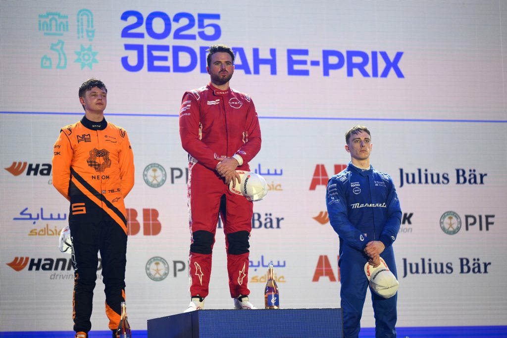 JEDDAH, SAUDI ARABIA – FEBRUARY 15: Race winner Oliver Rowland of Great Britain and Nissan Formula E Team Second placed Taylor Barnard of Great Britain and NEOM McLaren Formula E Team Third placed Jake Hughes of Great Britain and Maserati MSG Racing on the podium during the Jeddah E-Prix, Round 4 of the 2025 FIA Formula E World Championship at Jeddah Corniche Circuit on February 15, 2025 in Jeddah, Saudi Arabia. (Photo by Simon Galloway/LAT Images for Formula E)