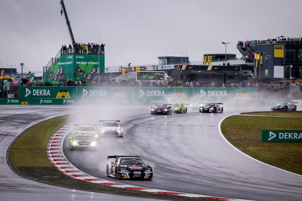 Kelvin van der Linde heeft de DTM-race op de Nürburgring gewonnen. De Zuid-Afrikaan startte vanaf pole op de natte baan in de Eifel. Tijdens de gehele wedstrijd kwam de overwinning niet in gevaar. Achter Van der Linde streden Bortolotti in de Lamborghini en Maro Engel in de Mercedes voor de tweede stek. Het was Mirko Bortolotti die als tweede de boeken in ging.