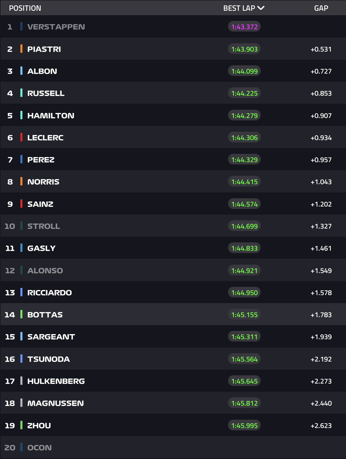 Oscar Piastri, de meest recente Grand Prix winnaar, noteerde met zijn McLaren de tweede tijd. Opmerkelijker was de snelste tijd van Alexander Albon. The Thaise Brit parkeerde zijn Williams op de derde positie.