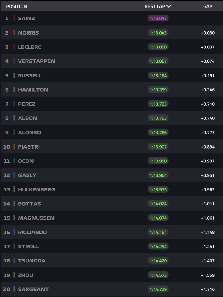 Carlos Sainz was met zijn Ferrari de snelste, hij hield Lando Norris’ McLaren 3/100e seconde achter zich. Charles Leclerc gaf met zijn Ferrari slechts 0,007 seconde toe op Norris en was 0,037 seconde sneller dan Max Verstappen in zijn Red Bull Racing bolide.